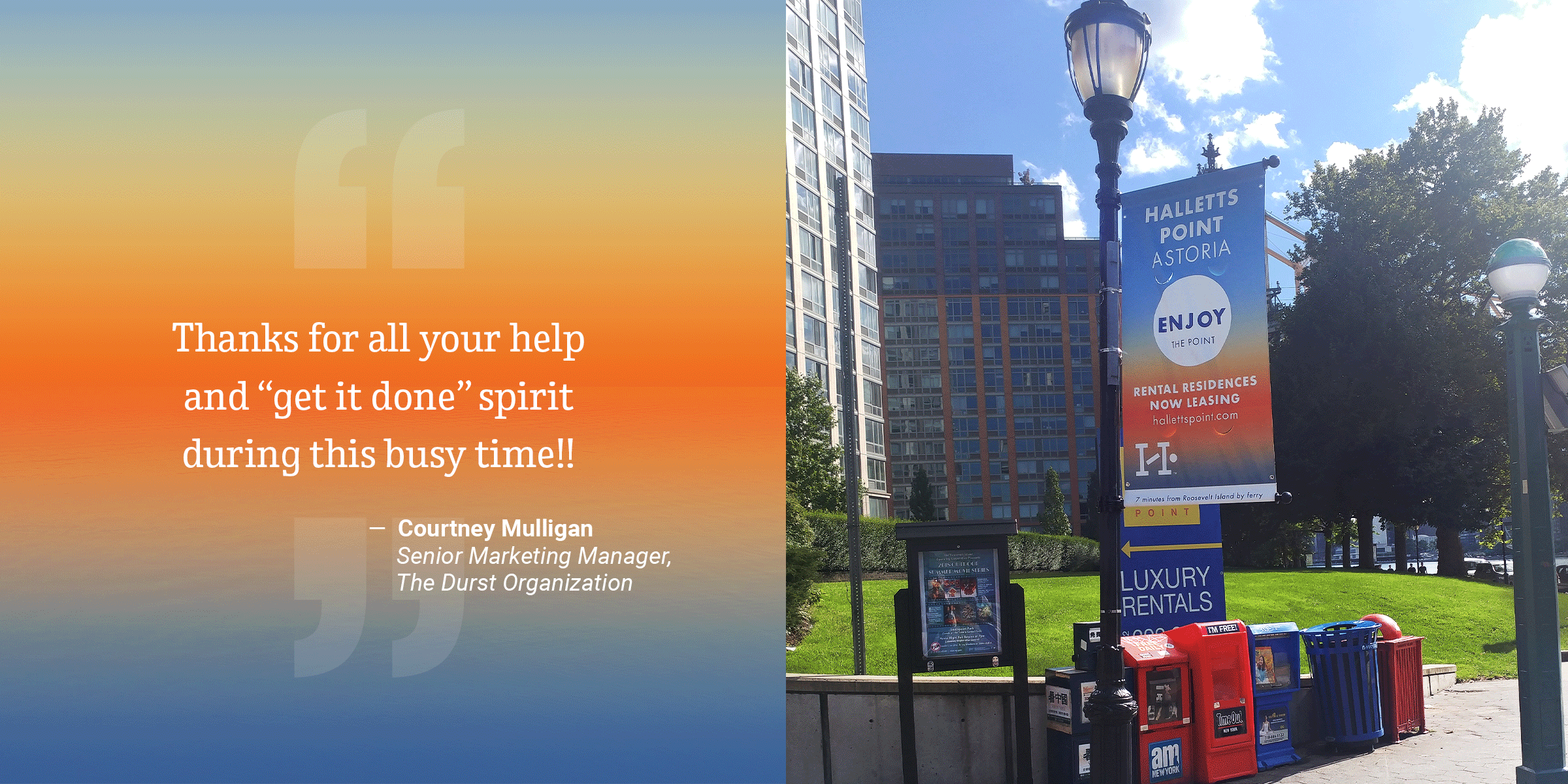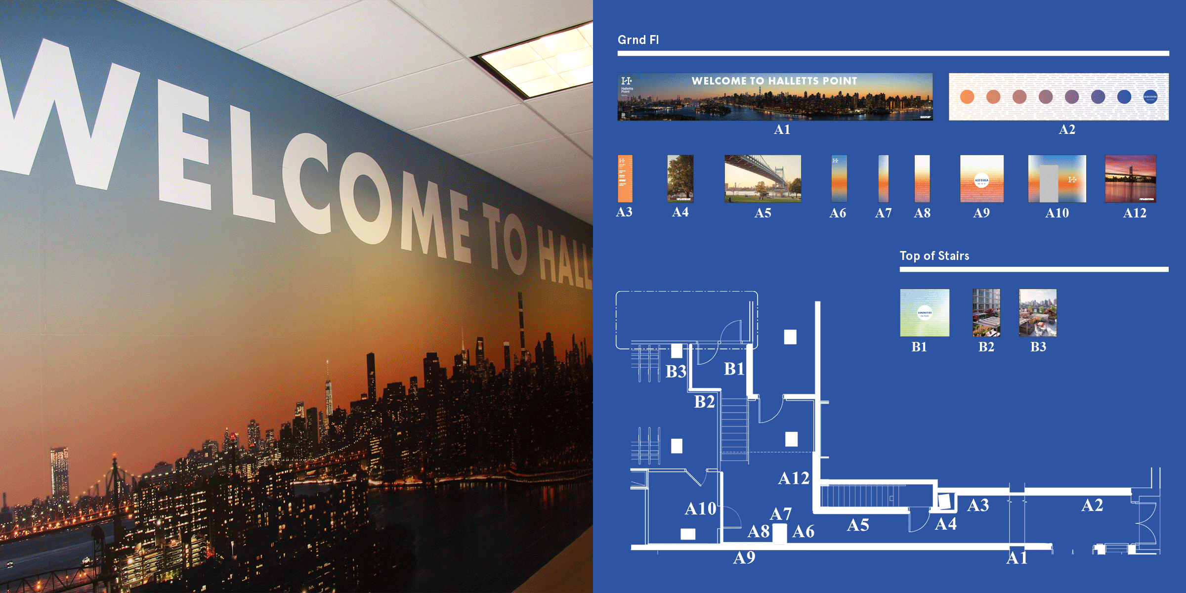 Strong Studio emulated the first-person experience of getting to 10 Halletts Point from different vantage points, ranging from the most direct to the most scenic and everything in between. After findings were proposed and selected, Strong Studio designed the wayfinding banners, power wash stencils, A-frames, and lamppost flags sprinkled along the ideal travel route.