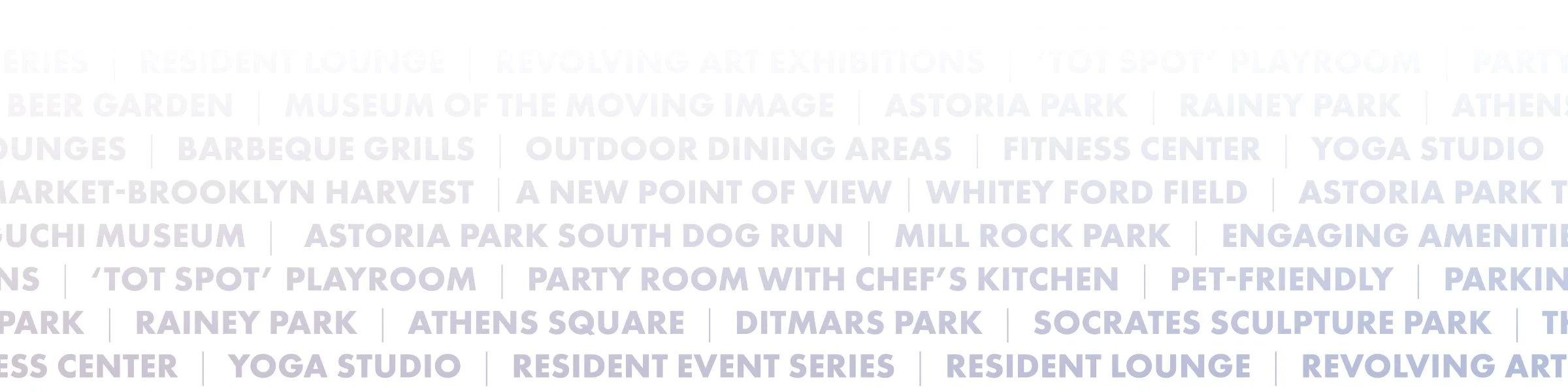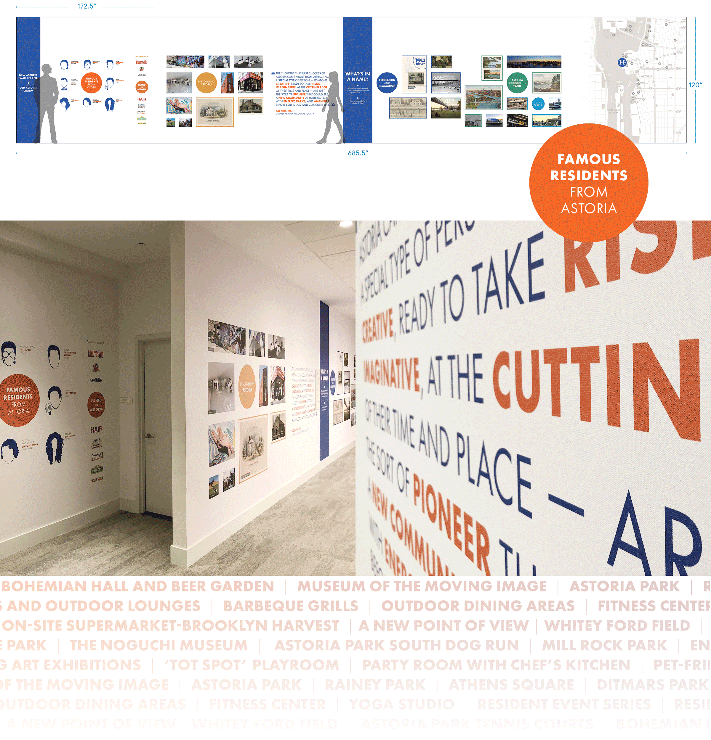 Outside the leasing office, Strong Studio created a floor-to-ceiling timeline graphic that illustrates Astoria’s rich history from a historic, geographic, and cultural standpoint.