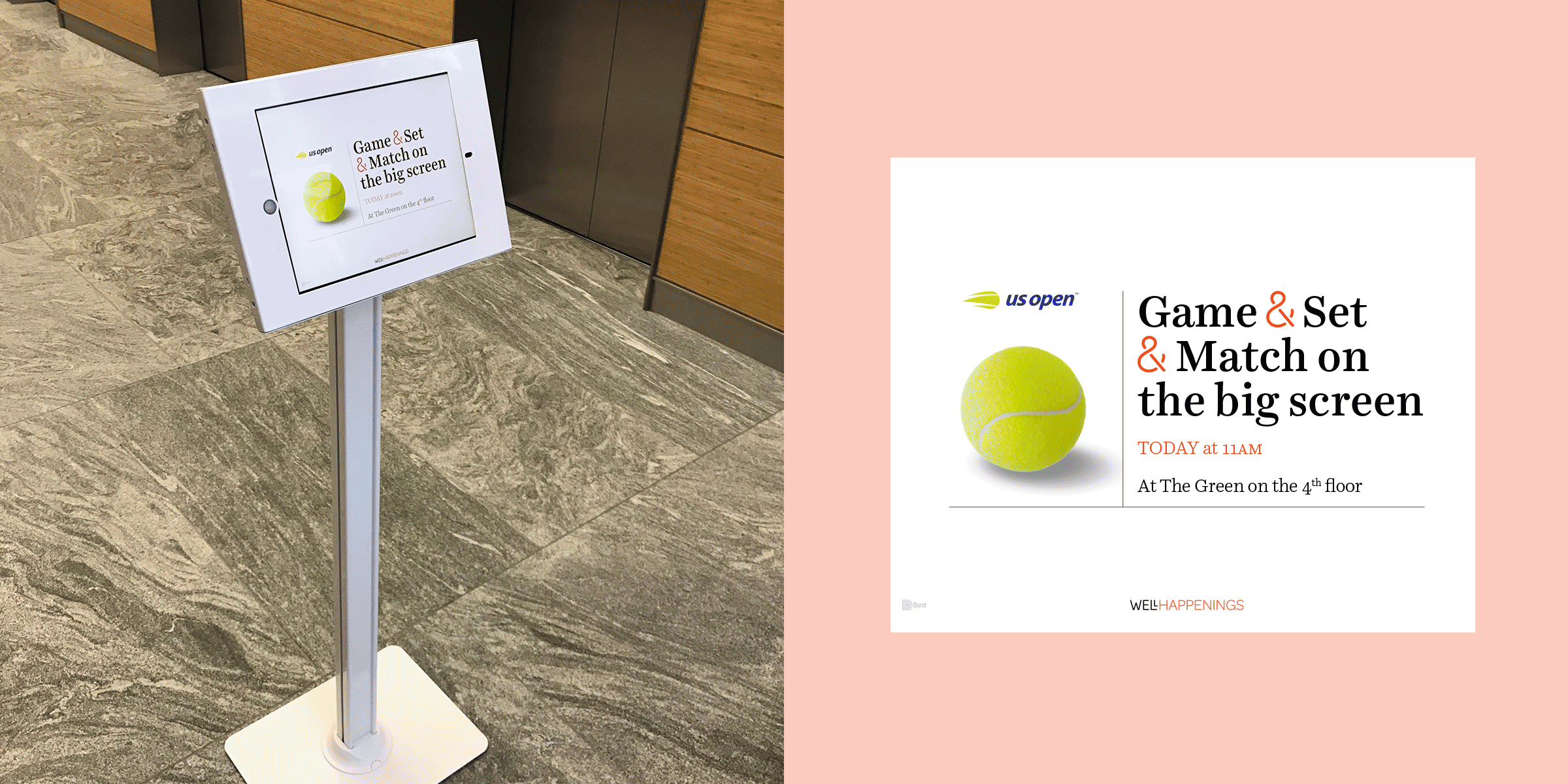The full suite of visuals is distributed throughout the fourth floor, and includes printed postcards and flyers, digital intranet and iPad screens, Mailchimp e-blasts, and social media assets.